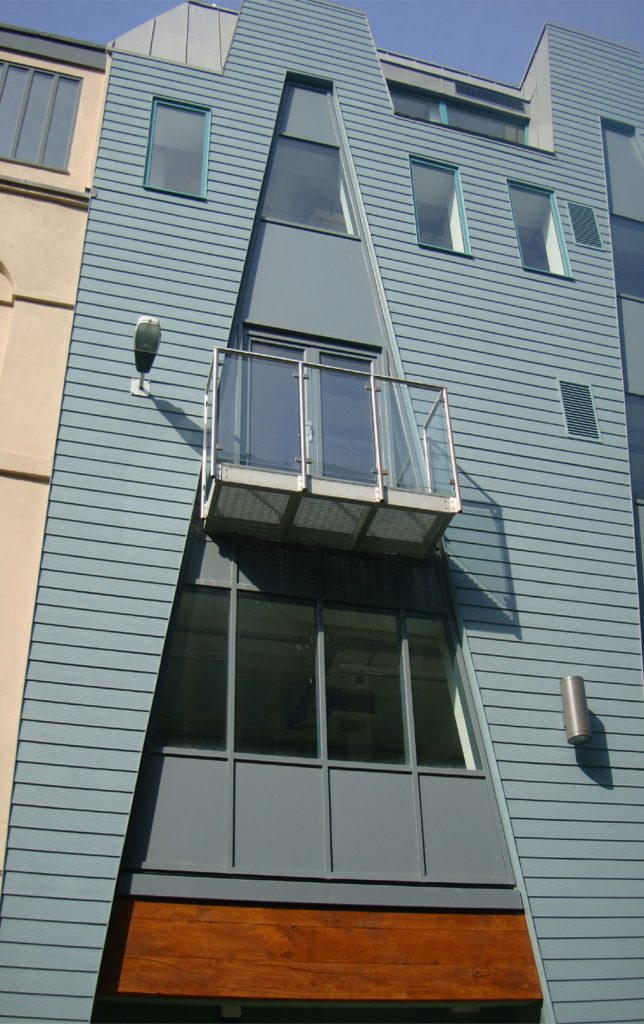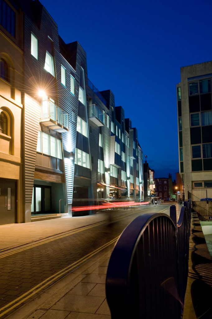 The street front is emphasized with a vertical rhythm of coloured cladding. Large triangular glazed panels travel up the façade to differing heights incorporating projecting elements providing a degree of modeling to the street frontage. Designed at planning stage by CZWG.